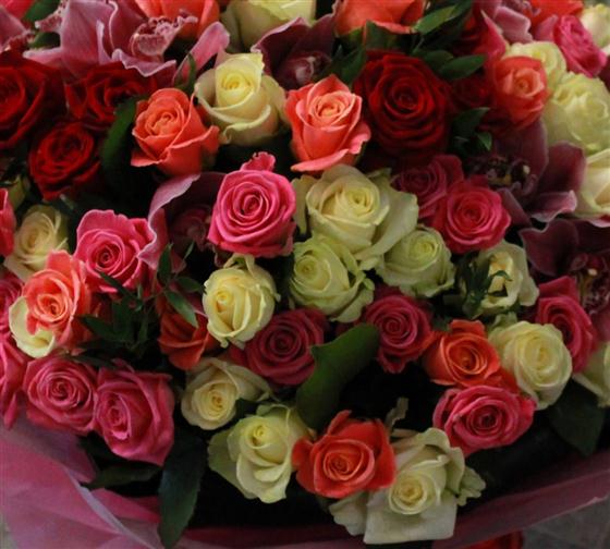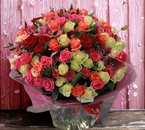 Please note that this is a mixed rose bouquet of the finest roses we have in stock. Accompanied with stunning orchids. It is very large and will make someone extremely happy. Kisses guaranteed.