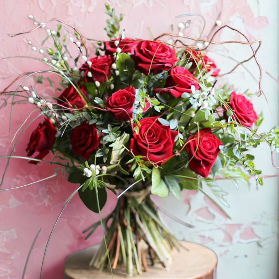 The Red Naomi rose is prized for its velvet-soft petals, deep red colour and superior quality. Grown by specialist rose producers in Holland, these luxurious blooms are carefully selected for their size, form and exceptional vase life. The addition of natural willow stems introduces movement, texture and a beautifully organic feel — creating a bouquet that feels passionate, expressive and a little bit wild.
