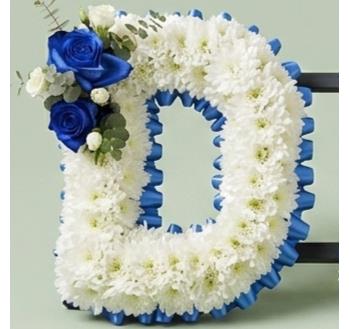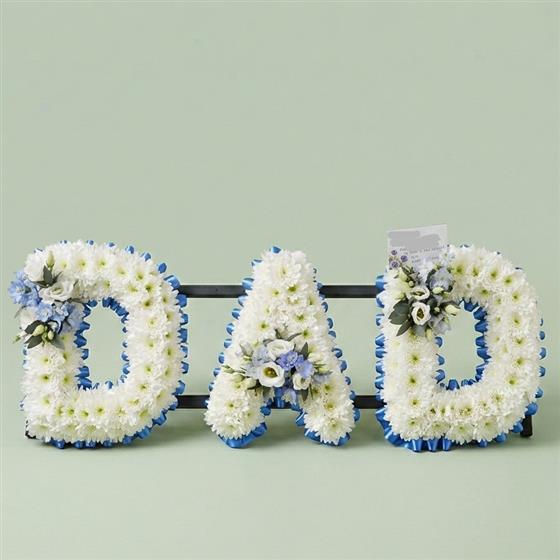 A classic and thoughtful funeral tribute, our Dad letter arrangement is created using a base of fresh white chrysanthemum, providing a clean and timeless backdrop. Each letter is carefully finished with delicate sprays and ribbon, which can be tailored in your chosen colours to reflect personal preference or meaningful themes.