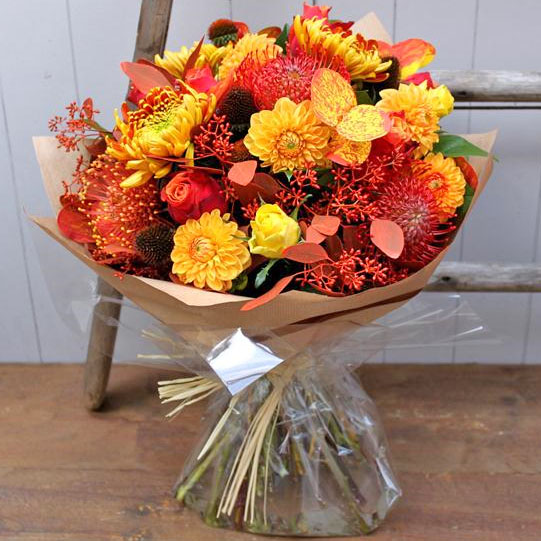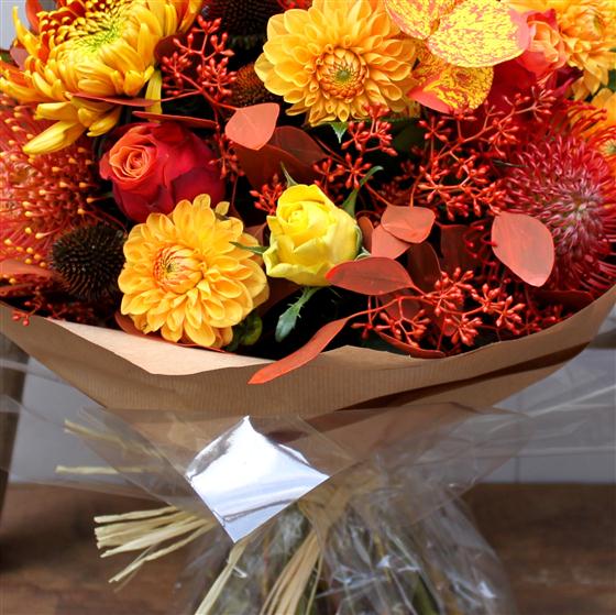 Rich, warm and full of autumn charm, Fallen Leaves captures the beauty of the season in a luxurious hand-tied bouquet.