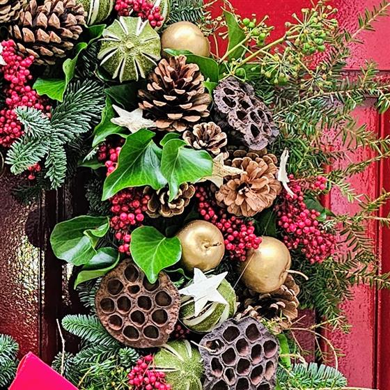 This festive offering is hand crafted by our own professional skilled florists. A 16" wreath is created using a medley of seasonal foliage including blue pine, sugar pine, douglas pine, eucalyptus and berried ivy to give a textured and interesting look and feel. Nestled around the wreath are clusters of festive red berries, dried fruits, lotus pods, pine cones, birch stars and decorative golden mini apples. Topped off with a velvet bow of choice.