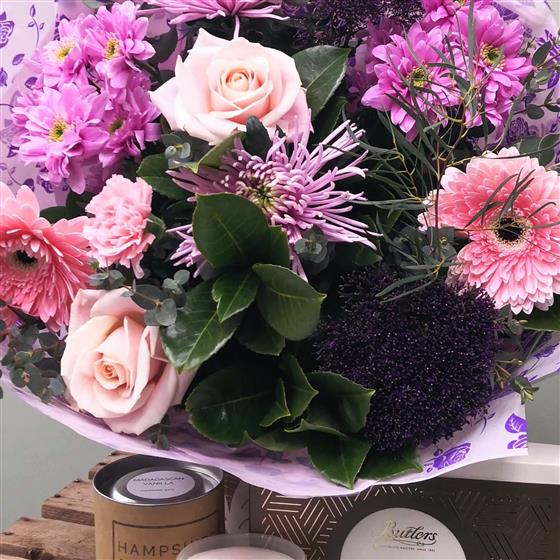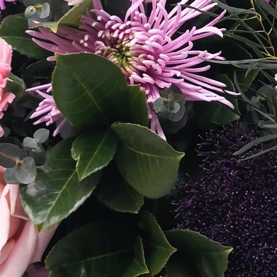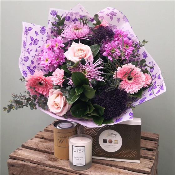 Flowers in sugary, sorbet shades of palest pink and a hint of royal purple are paired with fresh Irish foliage and eucalyptus for a lovely bouquet that Mum would be happy to receive. The selection includes pale pink roses, pale pink carnations, pink blooms, pink chrysanthemum spray, pale pink gerbera and trachelium.