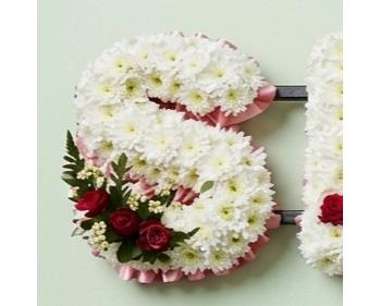 Each letter is carefully hand-crafted using soft white chrysanthemum blooms, chosen for their gentle beauty and symbolism of honour and devotion. Set against this serene white base, a coordinating ribbon and floral spray can be personalised in a colour of your choice—allowing you to create a truly meaningful and individual farewell.