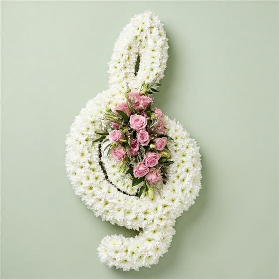 A heartfelt tribute for someone whose life was filled with music. This treble clef design is crafted with fresh flowers and offers a meaningful way to honour a musician, music teacher, or anyone who found joy and comfort in music.