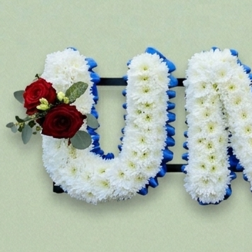 Each letter is expertly hand-crafted using pure white chrysanthemum blooms, chosen for their soft, elegant appearance and their traditional symbolism of honour and lasting memory. The arrangement is finished with a ribbon and floral spray in a colour of your choice, allowing you to personalise the tribute in a way that feels most fitting and heartfelt.