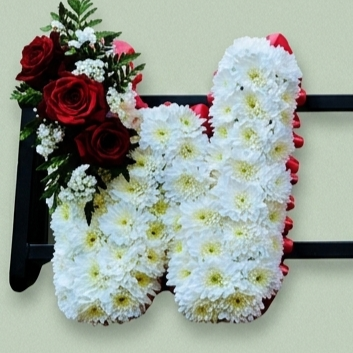 Our 10" funeral letters are carefully hand crafted by our own professional, qualified florists. Each letter is created using a base of pure white chrysanthemum. The letters are finished with a pretty spray of seasonal flowers and a smart ribboned edge (please choose the colours of spray and ribbon from our drop down menu)